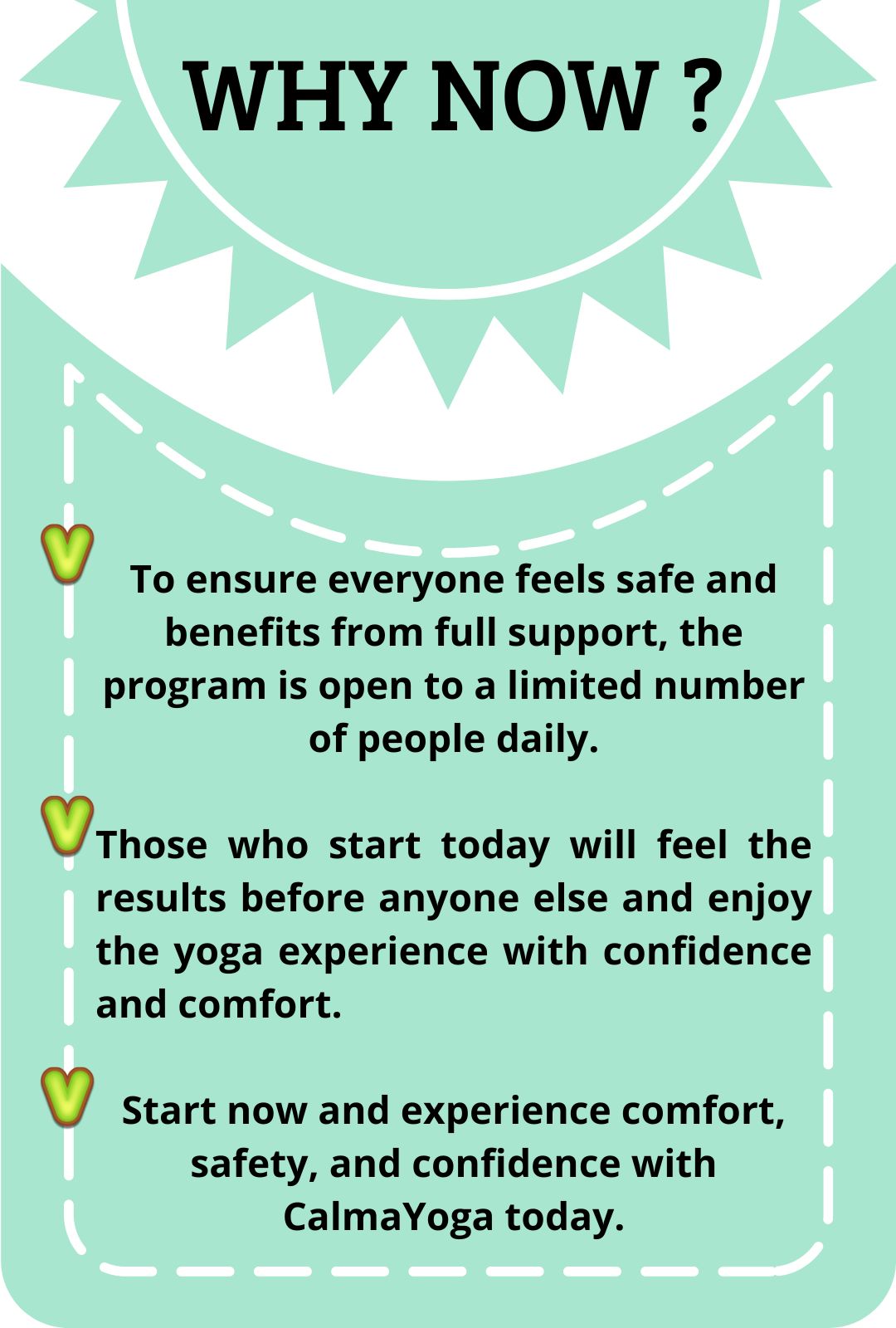 CalmaYoga is a system that guides you step by step to begin yoga with confidence and calmness — without fear of injury, without body shame, and without pressure from others.